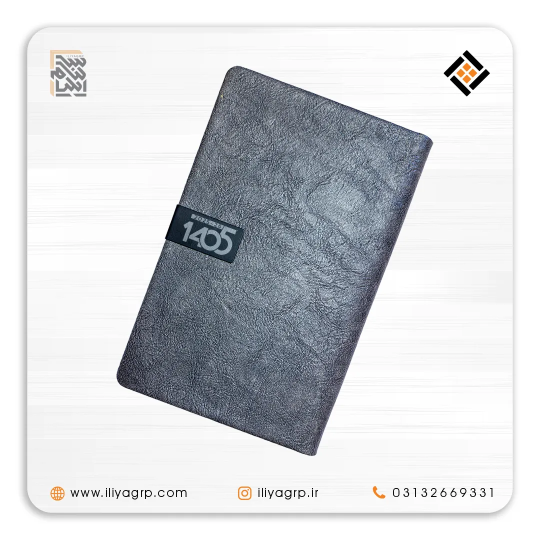 سررسید ۱۴۰۵ ایلیا با جلد چرم طوسی دودی مات و بافت ابریشمی، ظاهری مینیمال، سنگین و فوقالعاده شیک. سالنامه ۱۴۰۵ لوکس و حرفهای، انتخاب مدیران مدرن، وکلا، مهندسان و بهترین هدیه سازمانی باکلاس.