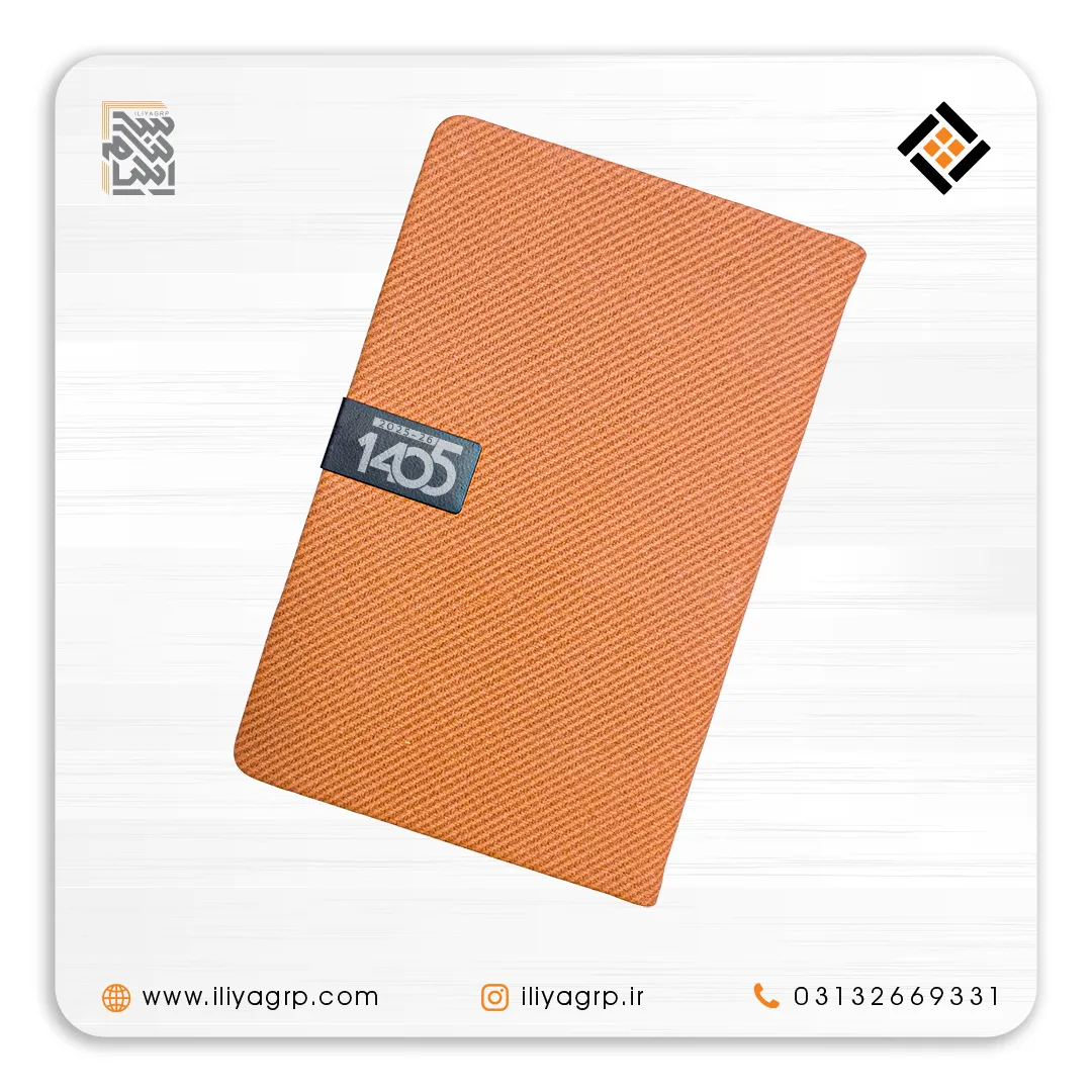 سررسید ۱۴۰۵ ایلیا با جلد پارچهای کتان نارنجی شتری (Camel) با بافت جناغی ظریف، رنگ گرم و انرژیبخش، طراحی مینیمال و مدرن. سالنامه ۱۴۰۵ شیک و متفاوت، انتخاب عالی برای مدیران جوان، طراحان، استارتاپها و هدیه سازمانی جذاب.