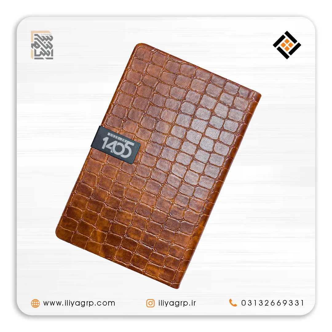 سررسید ۱۴۰۵ ایلیا با جلد چرم کروکودیل عسلی-قهوه‌ای برجسته، بافت لوکس و کلاسیک، ظاهری قدرتمند و مجلل. سالنامه ۱۴۰۵ لاکچری، انتخاب مدیران ارشد، وکلا، پزشکان و بهترین هدیه سازمانی VIP با حس اصالت و ابهت.